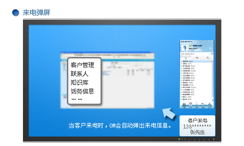 400企业用户开通此功能后,可绑定呼叫中心坐席与爱讯OM相连接。400用户用400平台登录帐号和密码登录爱讯OM。当客户拨通400号码时,爱讯OM出现弹屏提醒并且出现呼叫中心坐席话务管理页面,坐席员工可在此页面记录客户的相关咨询和信息,并且能通过知识库中的相关知识回答客户咨询的相关问题。