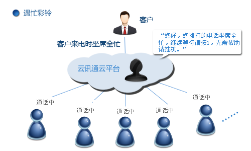遇忙彩铃是打造一个全新、立体的企业形象的业务功能,当企业开通遇忙彩铃业务后,主叫客户在坐席全忙时拨通400号码,提示的不再是“嘟……嘟……”声,而是有声的服务提醒,以达到改善客户服务质量的功能。