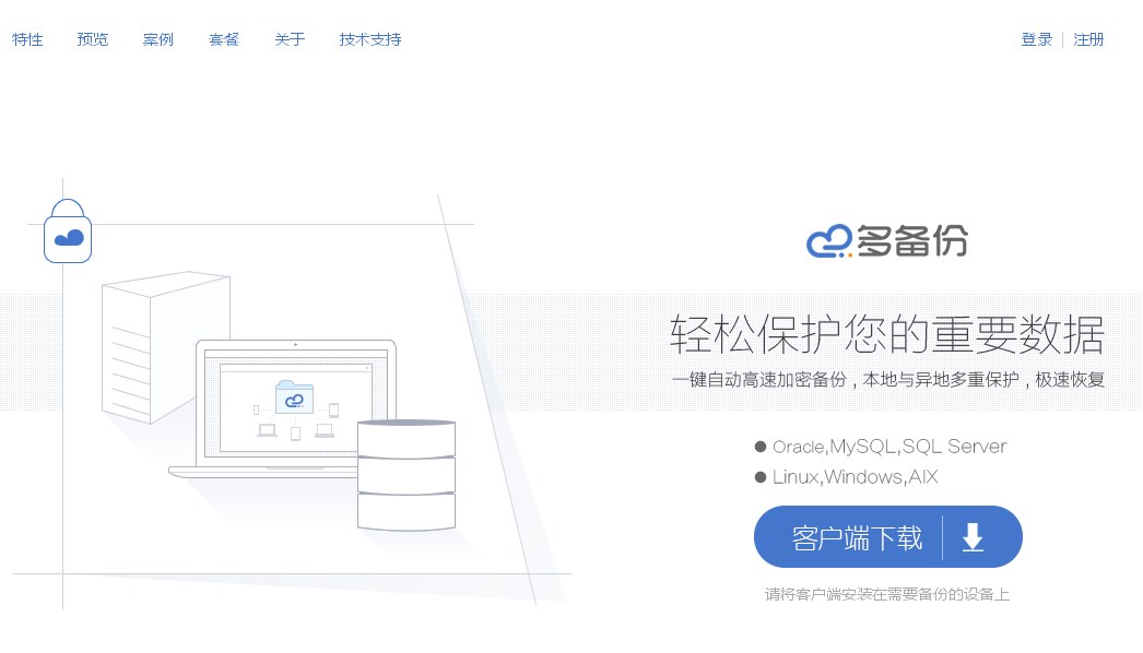 对比传统备份软件,我们提供多种灵活的部署和使用方式,客户既可以在单台设备上使用多备份客户端保护数据;也可以在web控制台集中管理名下的所有设备数据,最多可同时管理数万设备的数据保护工作。多备份支持主流数据库MySQL, SQLserver, Oracle;主流文件系统; 支持个人PC、工作站、服务器、小型机,从Linux,Windows到AIX等操作系统;目前多备份已与全球9大云平台厂商,包括阿里云,腾讯云,微软云,金山云,UCloud,七牛,亚马逊云,百度云等进行了深度合作,可保护客户国内外多地的重要数据。
