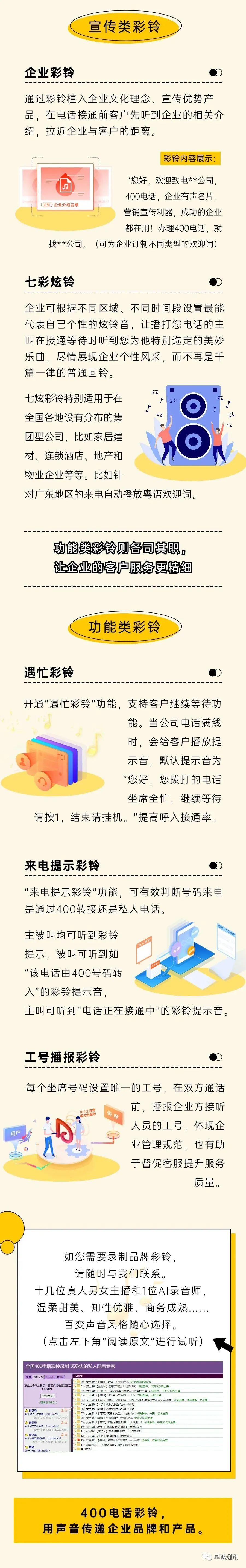 通过彩铃植入企业文化理念、宣传优势产品.在电话接通前客户先听到企业的相关介绍.拉近企业与客户的距离。找**公司彩铃内容展示:”您好.欢迎致电””公司. 400 电话.企业有声名片、营销宣传利器.成功的企业都在用!办理 400 电话.就 《 可为企业订制不圈类型的欢迎词)七彩炫铃. ) 企业可根据不同区域、不同时间段设万最能代表自己个性的炫铃音.让播打您电话的主叫在接通等待时听到您为他特别选定的美妙乐曲.尽惰展现企业个性风采.而不再是千篇一律的普通回铃。-户‘心叮户“‘七炫彩铃特别适用于在全国各地设有分布的集团型公司.比如家居建材、连锁酒店、地产和物业企业等等。比如针,海对广东地区的来电自动播放粤语欢迎词