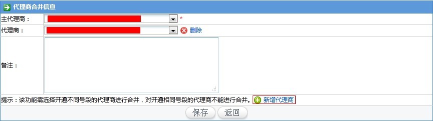 将3.0平台多个不同号段的下级代理商合并为一个代理商,合并的代理商拥有之前合并代理商的400业务、号码预占信息、400号码、下级代理商等;