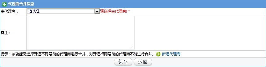 3、 点击搜索下方的【新增代理商合并】按钮,进入新增代理商合并页面,如下图所示: